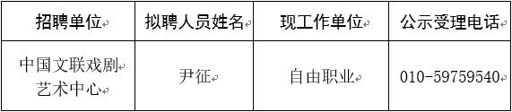 根據(jù)《中國(guó)文聯(lián)系統(tǒng)事業(yè)單位2018年公開(kāi)招聘社會(huì)在職人員公告》精神,經(jīng)過(guò)資格審查、筆試、面試、體檢、考察等環(huán)節(jié),擬聘用尹征同志為中國(guó)文聯(lián)戲劇藝術(shù)中心工作人員,現(xiàn)予以公示。公示期間,如有問(wèn)題,請(qǐng)向用人單位反映或舉報(bào)。
